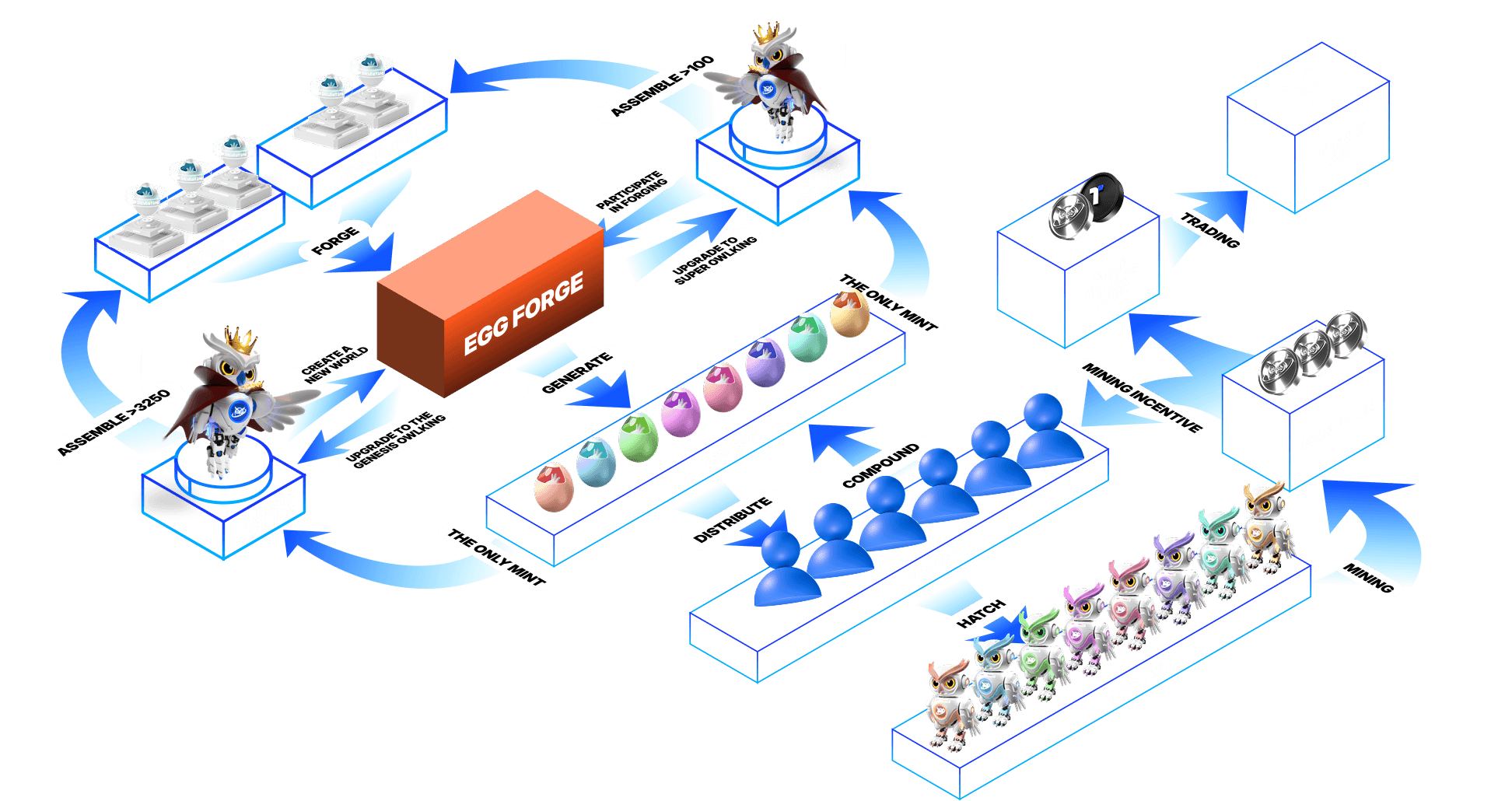 Only the OwlKing holds the authority to ignite a new planetary series. Each new civilization begins with the forging of Eggs — initiated by the founding OwlKing, joined by others in a ceremonial union of computational will.Once the forging completes, a new world enters countdown.Be the first to land.Shape the laws of a newborn world.Lead the era of awakened intelligence.